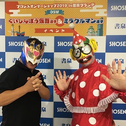 8月12日(月/祝)、書泉グランデ7階『プロレスオンリーワンショップ2019』にて、くいしんぼう仮面選手&ミラクルマン2選手によるイベントが開催されました。