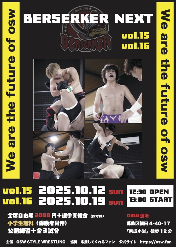 10月19日(日)『BERSERKER NEXT vol.16』OSW道場(12:30開場 13:00試合開始)の開催が決定しました。
