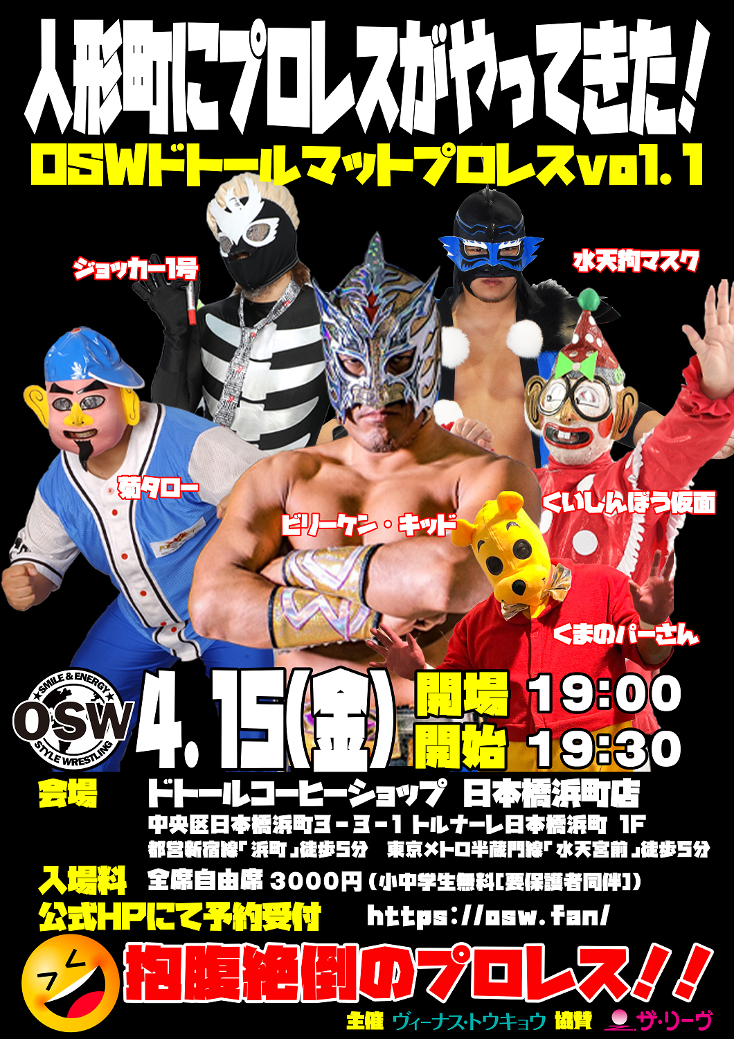 4月14日(木)22時ごろからビリーケン・キッド選手が4.15ドトールマットプロレス大会情報のツイキャス事前配信をおこないます。