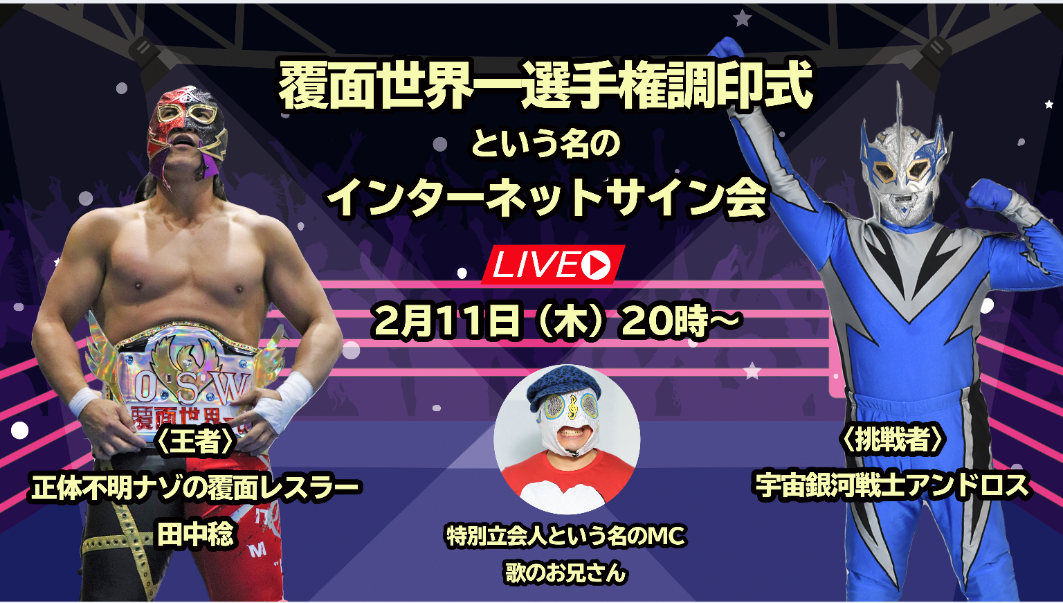 2月11日(木・祝)20時より、2.14東京芸術センター ホワイトスタジオで開催される『OSW認定覆面世界一選手権』田中稔vs宇宙銀河戦士アンドロスの公開調印式&インターネットサイン会をおこないます。