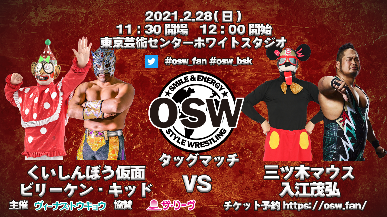 今回も地元・足立区出身のビリーケン・キッド、笑いの伝道師・くいしんぼう仮面がタッグを結成。#STRONGHEARTSの入江茂弘とOSWの腹黒鼠・三ツ木マウスがタッグを組む。こちらは1月10日・北千住大会で組まれていたカードだ。大阪プロレスが主宰していたプロレス学校出身の入江がコーチを務めたビリーと対峙する。ビリーは「OSWのスタイルは知っているよね?」と聞くと入江は「IMPホールとかでビリーさんの激しい試合をよく見ていました」と返答。ビリーは「OSWはそんな激しいしスタイルじゃないから」と念を押す。