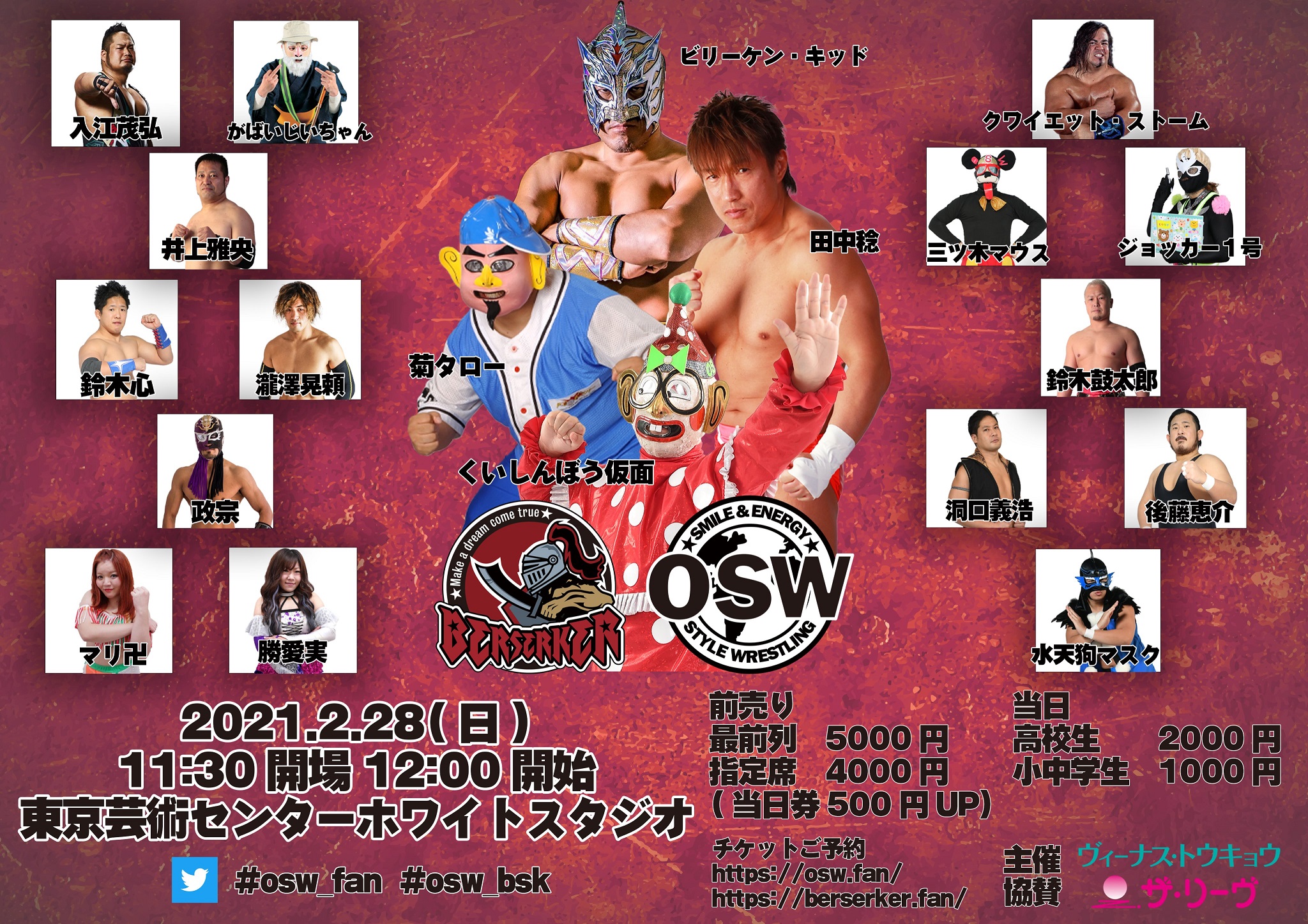 2月28日(日、12時試合開始)『OSW&BERSERKER Vol.6』北千住大会の試合順が決定しました。あわせて各試合の見所、直前情報をお知らせいたします。