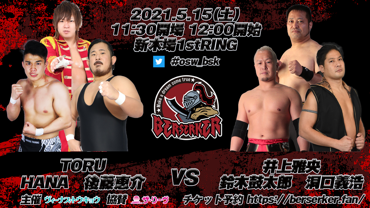 第3試合は出場予定だった瀧澤晃頼が新型コロナウイルス感染により欠場となり、代わりに後藤恵介がBERSERKER若手軍に。TORU、HANAとトリオを組み、井上雅央、鈴木鼓太郎、洞口義浩と対戦する6人タッグ。OSW所属のHANAが個性派揃いの6人タッグでどれだけ存在感を発揮できるのか?