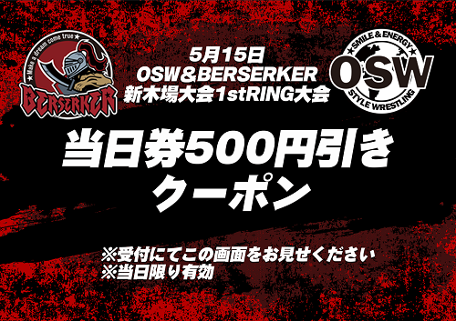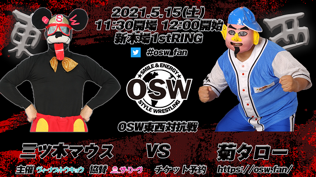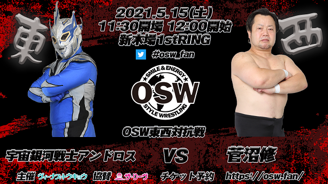 オープニングマッチはOSW東西対抗戦の先鋒戦。4.18北千住のメインの特別レフェリー・菊タローが試合中に巻き込まれて失神。代わりにレフェリングしたアンドロスの高速カウントで負けてしまった菅沼修。開戦のきっかけとなった両者が東西対抗戦・先鋒で激突する。アンドロスは「新あたらしいおニューの必殺技を開発した」と豪語。菅沼は「二度と西に足向けて寝れんようにしてやる」と意気込んでいる。対抗戦第1ラウンドからどんな笑いの雨が降るのだろうか?