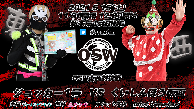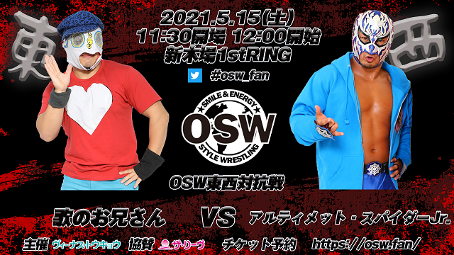 第4試合はOSW東西対抗戦の副将戦。試合中に歌をうたったりマスクを脱いだりと自由奔放な歌のお兄さん。しかし今回は「2020年、OSWを陰で支えてきたのはこの私。後輩がのし上がってくるのは恐怖でしょう。5.15は試合中に歌わない。試合後に奏でるのはあなたに捧げるレクイエムだけだ」と静かな闘志を燃やしている。一方、スパイダーは「マスクを脱いで笑いに変える奴は大嫌いだ!歌のおにいさんを潰して歌えなくしてやる!」と荒ぶる。他の3試合とは違う戦いになりそうだ。