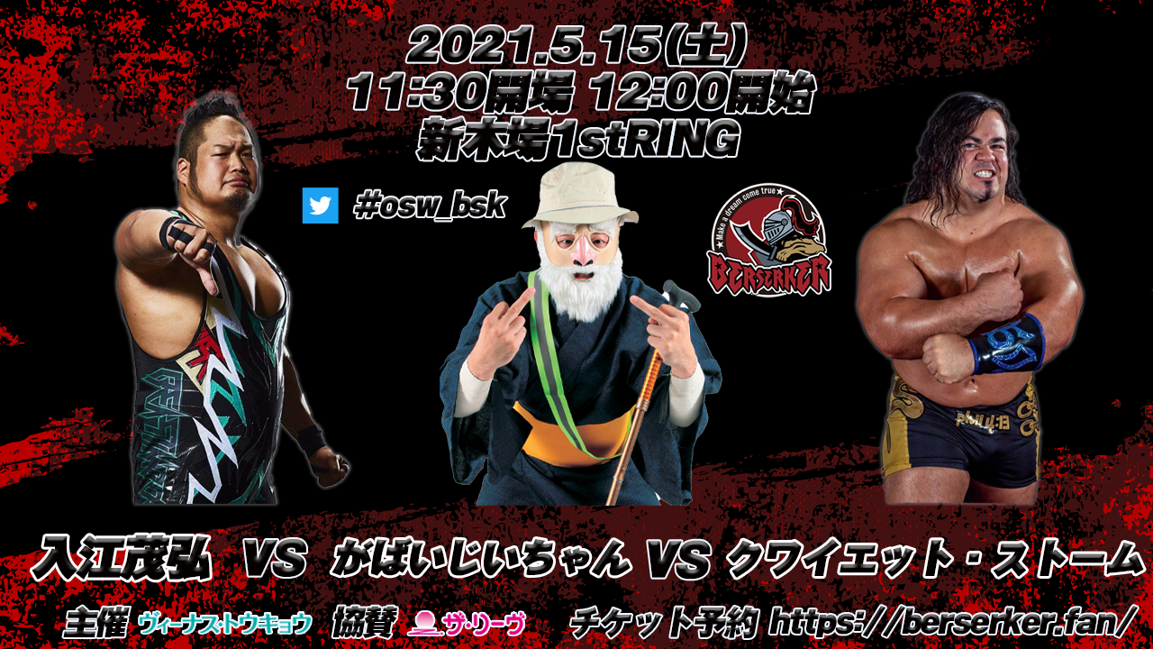 当初、入江茂弘&がばいじいちゃんvsクワイエット・ストーム&後藤恵介のタッグだったが、後藤が瀧澤晃頼の代わりに第3試合に移動したため、急遽3WAYマッチでおこなわれることに。がばいじいちゃんがヘビー級の入江、ストームを相手にどんな戦い(?)を見せてくれるのか?無事にリングを降りて来れるのか?