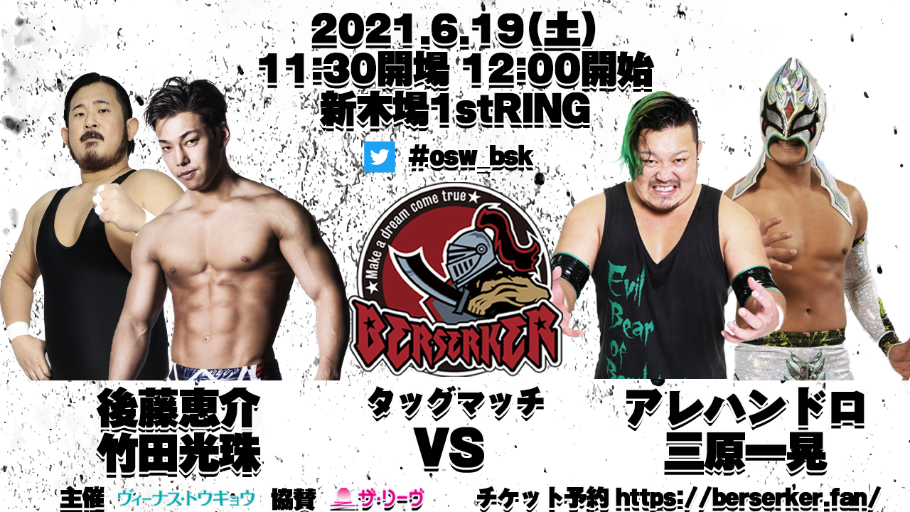BERSERKERレギュラーの後藤恵介が666の人気選手・竹田光珠と東北出身タッグを結成。竹田はくいしんぼう仮面自主興行時代に何度か参戦があるもののOSWは初参戦。対戦相手は道頓堀プロレスのWDW(レスリング道頓堀ワールド)王者の三原一晃がOSW初参戦。三原は「何故か初参戦のような気がしない」とコメント。パートナーはこちらもOSW初参戦のアレハンドロとタッグを結成。ヘビー級&ジュニアヘビー級のタッグ対決はBERSERKERらしい激しいバトルが繰り広げられそうだ。