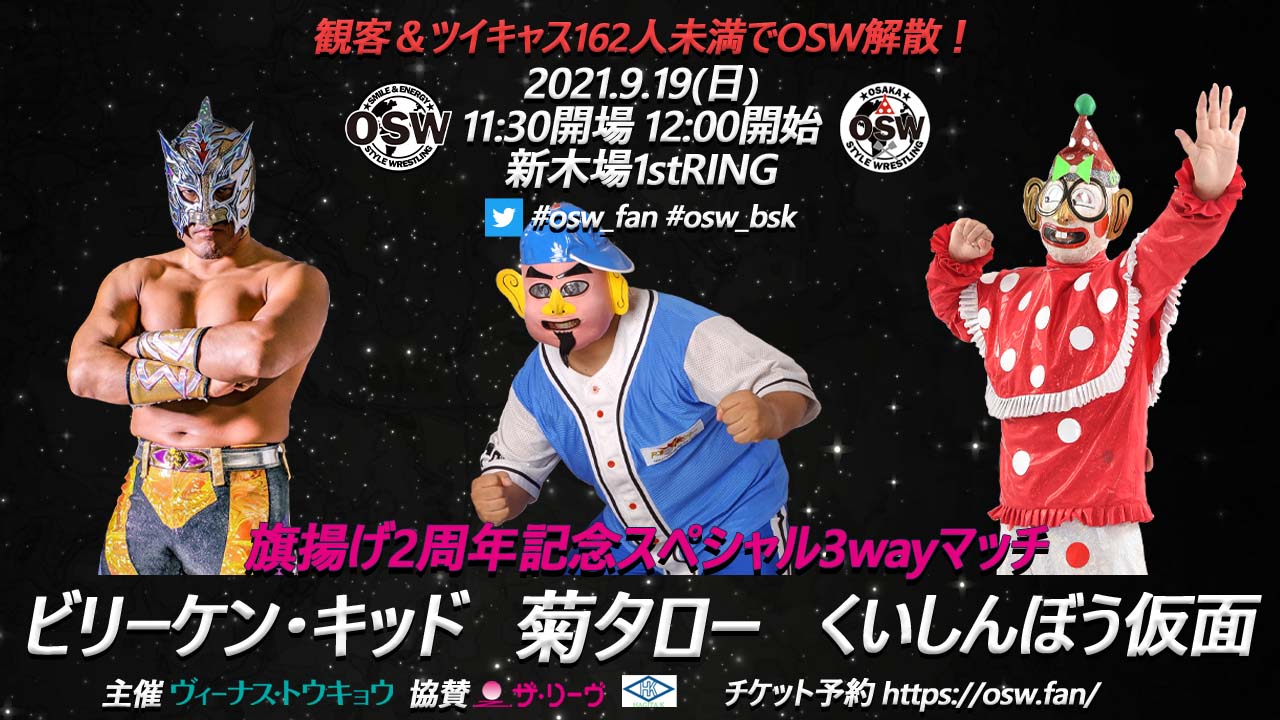 9月1日に旗揚げ2周年を迎えたOSW。旗揚げ時のエース・くいしんぼう仮面、その永遠のライバル・菊タロー、そしてOSW新エースのビリーケン・キッド、3選手がOSWの2年間を凝縮した?スペシャル3WAYマッチで対戦する。