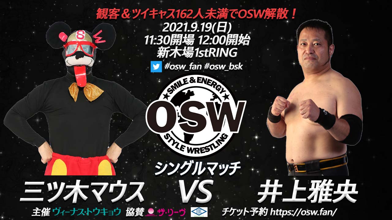 OSWの人気キャラ・三ツ木マウスの追加参戦が決定、井上雅央との『イッツアスモールワールドvsマサオワールド』の異色対決が実現する。