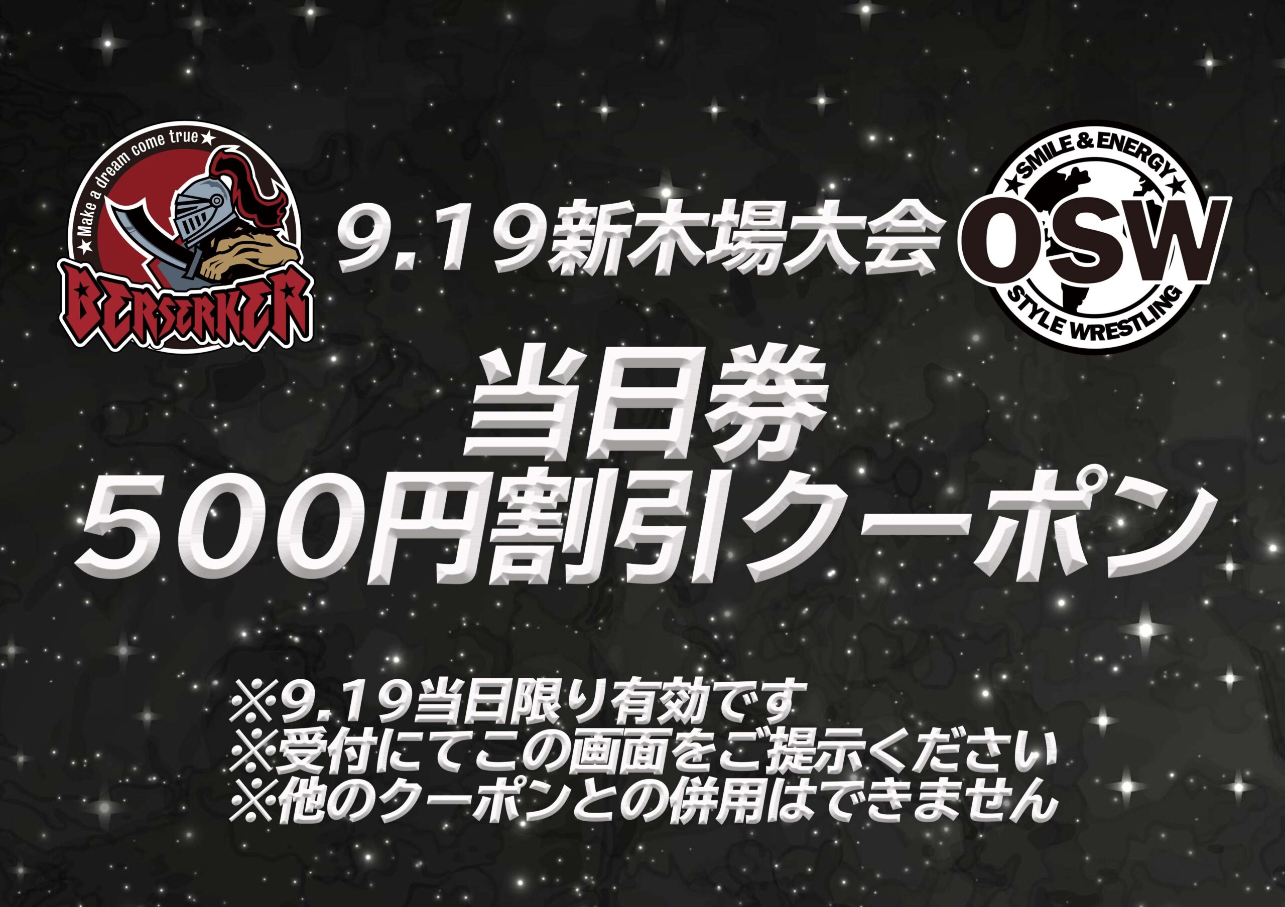 当日ギリギリまで仕事の予定がわからない方、急に予定が空いた方、他団体観戦前に見に来ていただける方に当日券が500円割引となるオンラインクーポンです。