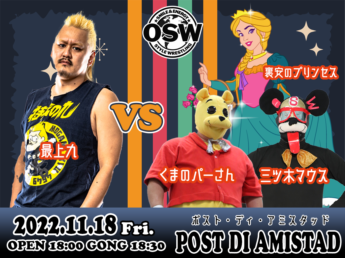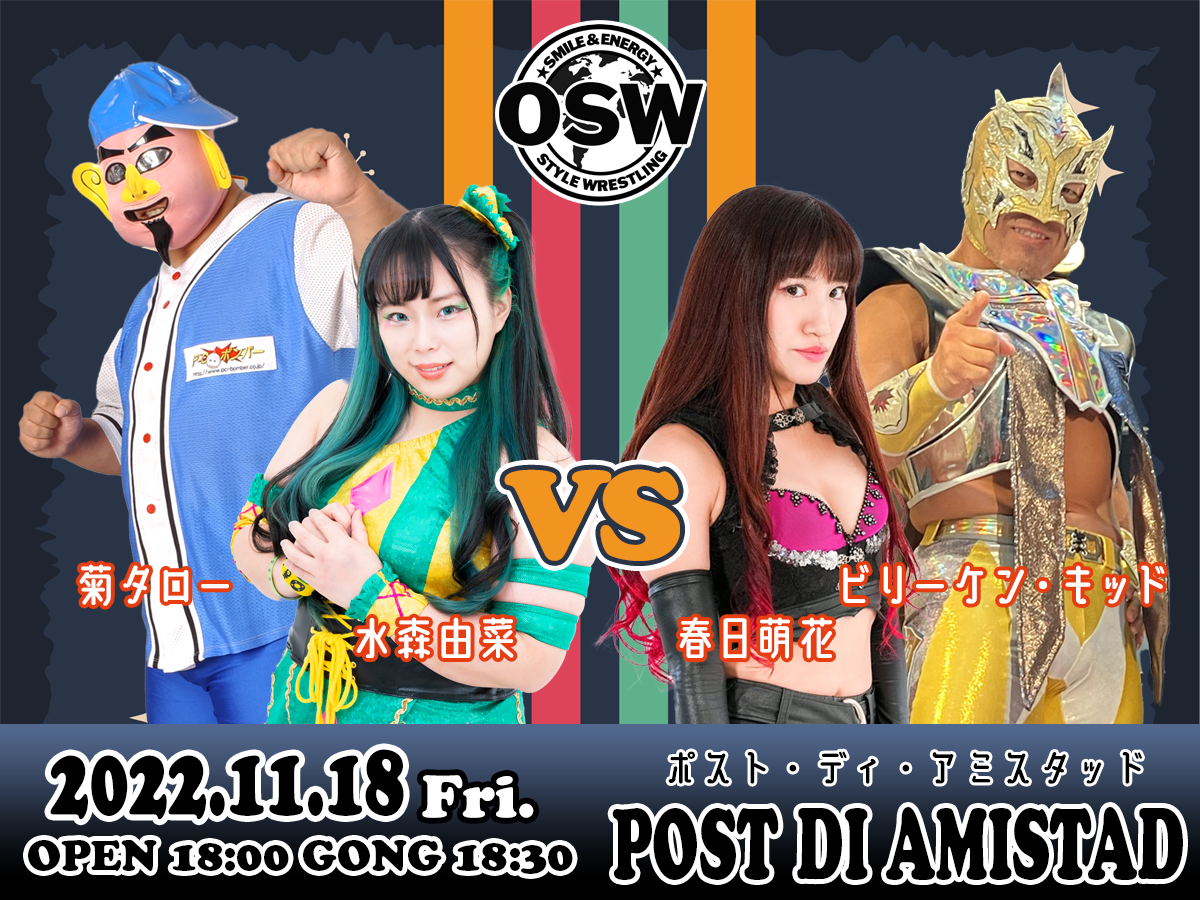 ビリーケン・キッドのOSW復帰戦は初参戦の春日萌花とタッグを結成し、OSW覆面世界一王者・菊タローとこちらも初参戦の水森由菜とのミクスドタッグマッチに決定した。10.22から連続参戦となる2AWの最上九は千葉決戦第2弾として、三ツ木マウス&くまのパーさん&裏安のプリンセスとの1vs3ハンディキャップマッチに挑む。