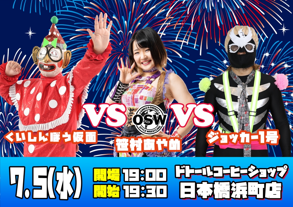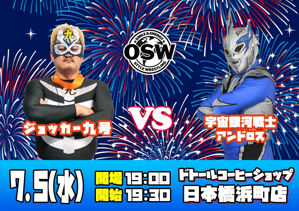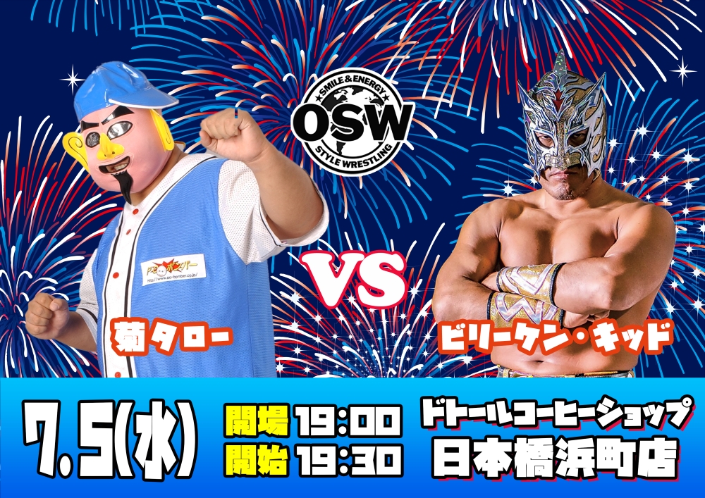 7月5日(水)<19:30試合開始>ドトールコーヒーショップ日本橋浜町店 『OSWドトールマットプロレスvol.14』全対戦カードが決定しました。