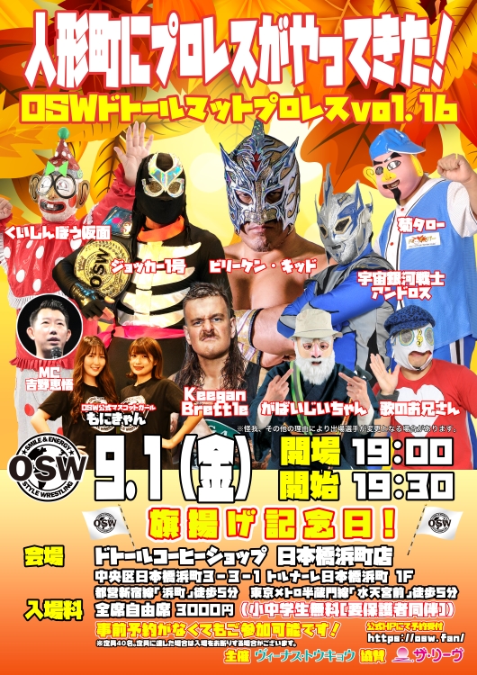 9月1日(金)<19:30試合開始>ドトールコーヒーショップ日本橋浜町店 『OSW旗揚げ記念日・ドトールマットプロレスvol.16』の参戦選手が決定しました。