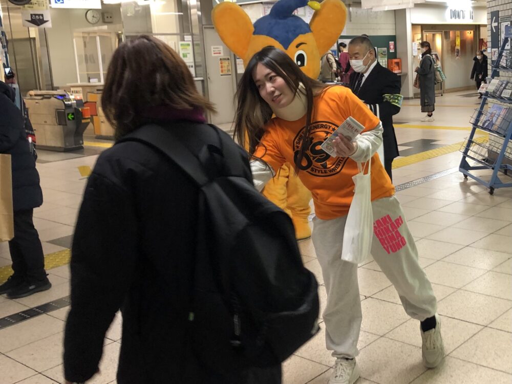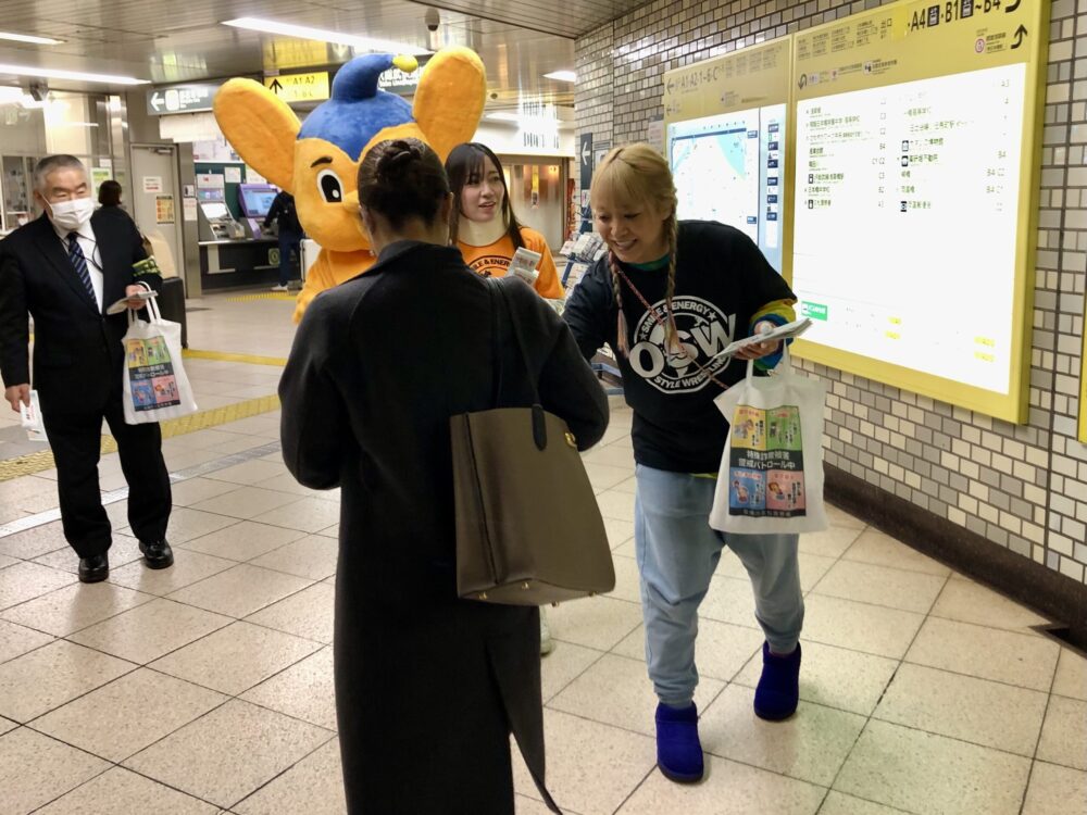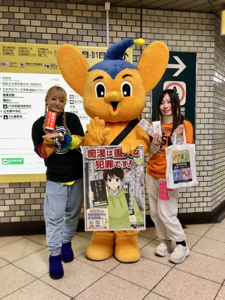 1月11日(木)、OSW女子部で活躍するCOLOR’SのSAKI選手と清水ひかり選手がOSWの本拠地・日本橋人形町、日本橋浜町が管轄となる久松警察署の痴漢撲滅キャペーンに参加しました。