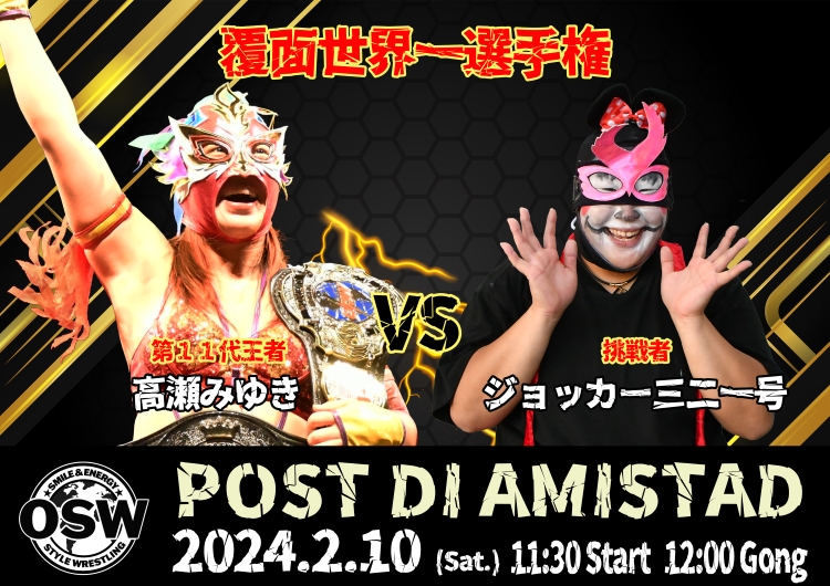 鈴木鼓太郎vsジョッカー1号、ビリーケン・キッドvsジョッカー九号という好カードのシングルマッチ2試合が組まれた。OSW男子軍vs女子部の抗争は、くいしんぼう仮面&菊タローvsSAKI&谷もものタッグマッチ、人形焼マンvsがばいジョッカーvs真琴の3WAYマッチとヒートアップすること間違いなし。覆面世界一選手権、高瀬みゆきvsジョッカー三二一号と合わせ、全5試合がラインナップ。プロレスで「エガオ」と「ゲンキ」をお届けします!