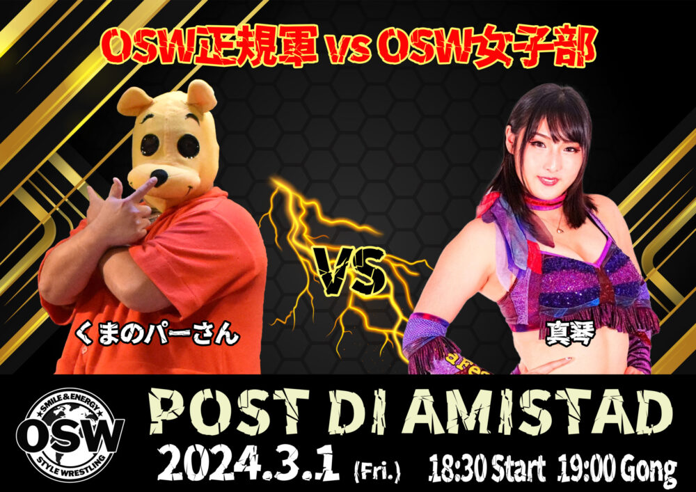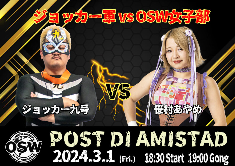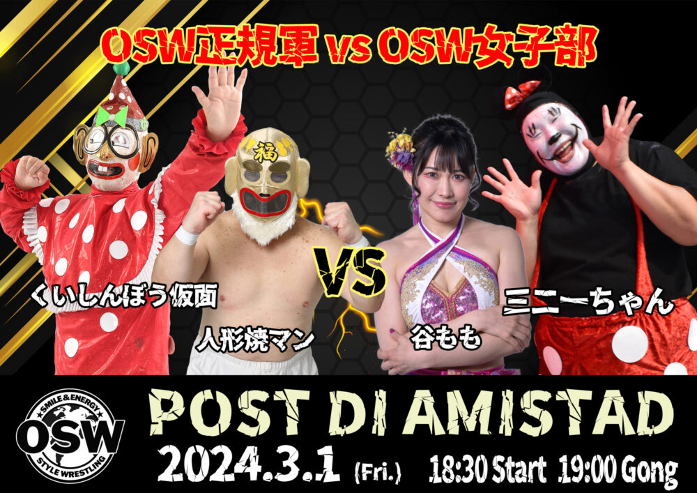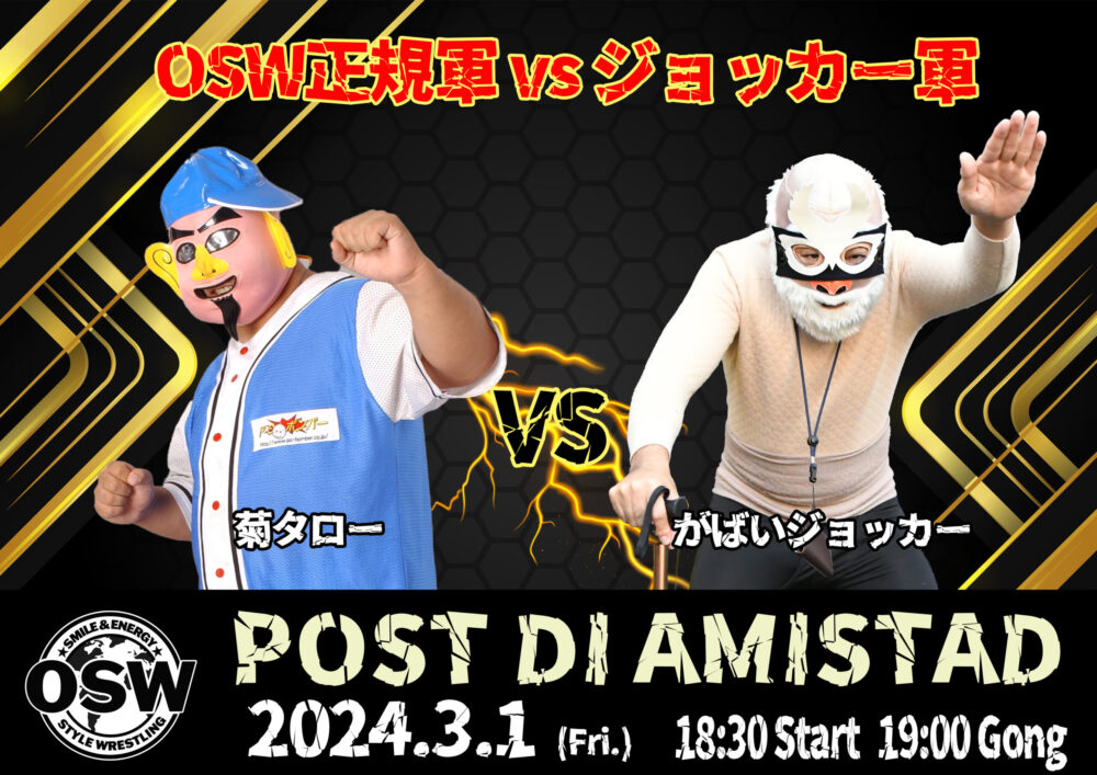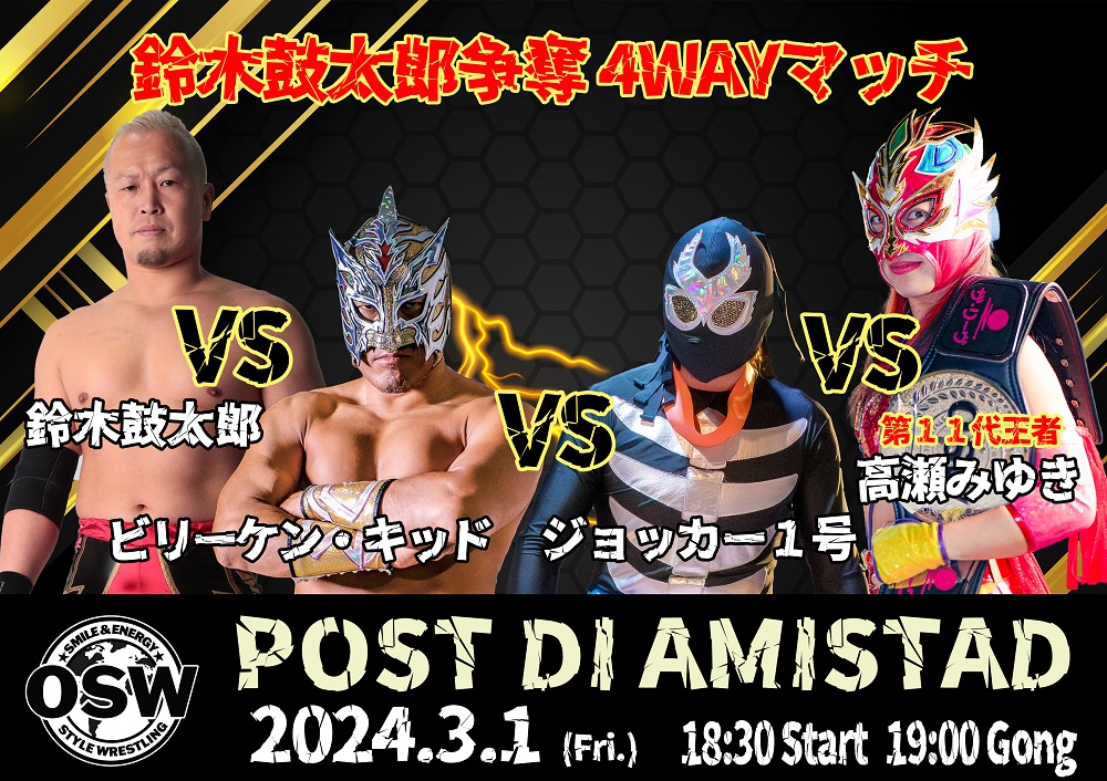 OSW正規軍・菊タローvsジョッカー軍・がばいジョッカー、正規軍・くまのパーさんvs OSW女子部・真琴、ジョッカー軍・ジョッカー九号vs女子部・笹村あやめ、の三軍団のシングルマッチマッチ3試合、正規軍・くいしんぼう仮面&人形焼マンvs女子部・三二一ちゃん&谷もものタッグマッチが追加決定し、メインの鈴木鼓太郎争奪4WAYマッチ・ビリーケン・キッドvs高瀬みゆきvs ジョッカー1号&鈴木鼓太郎の全5試合が決定!