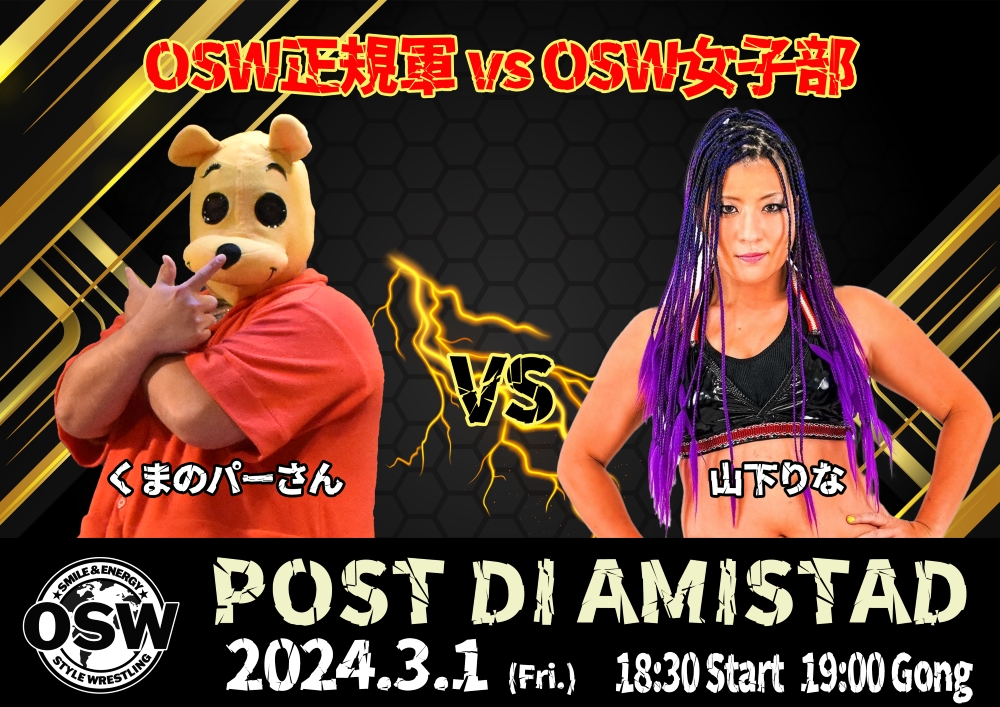 代替え選手として、山下りな選手がOSW初参戦、くまのパーさんとシングルマッチをおこないます。