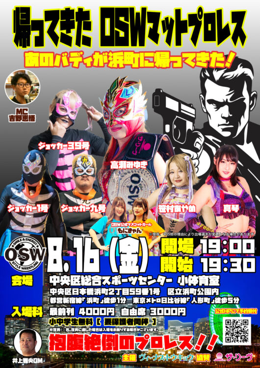 8月16日(金)中央区総合スポーツセンター小体育室で開催される『浜町マットプロレス』(19時30分開始)の全対戦カードが決定しました。
