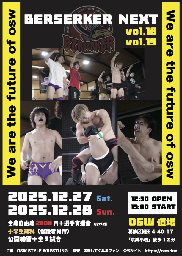 12月27日(土)『BERSERKER NEXT vol.18』、28日(日) 『BERSERKER NEXT vol.19』 OSW道場(両日とも12:30開場 13:00試合開始)の開催が決定しました。